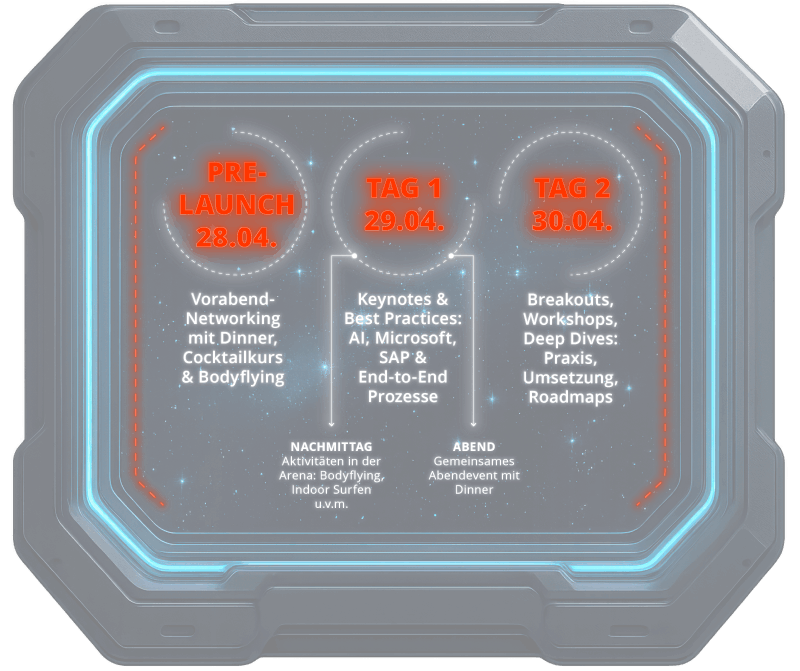 In der Jochen Schweizer Arena in München starten wir vom 29. bis 30. April 2026 in eine interstellare Reise voller Innovation, Automatisierung und Use Cases. Werden Sie Teil unserer Crew und heben Sie mit uns ab.