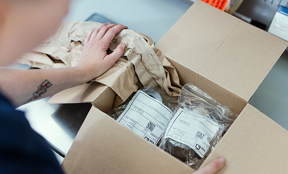Une fois sur place, les unités de prélèvement sont consolidées et déposées sur un convoyeur à rouleaux (dans l’ordre de livraison) à l’aide d’une application mobile de distribution sur table d’emballage, développée par ORBIS spécifiquement pour le site de Grünstadt. Dès que le processus est terminé, l’application alerte l’utilisateur, qui transfère alors les pièces vers la table d’emballage où elles sont conditionnées. Le processus d’emballage est géré via le Packaging Cockpit d’ORBIS intégré à SAP, que le site de Grünstadt utilise depuis un certain temps.